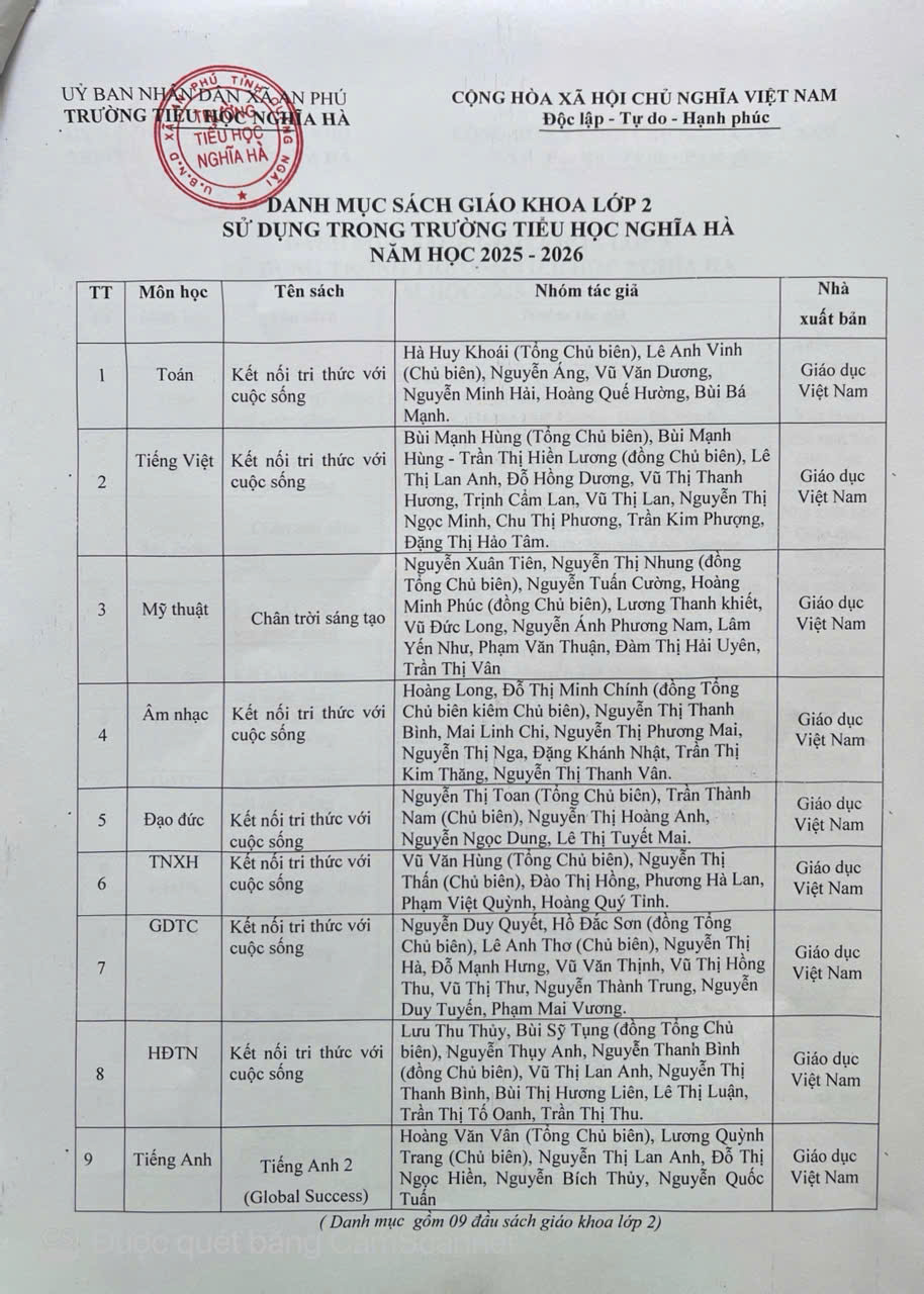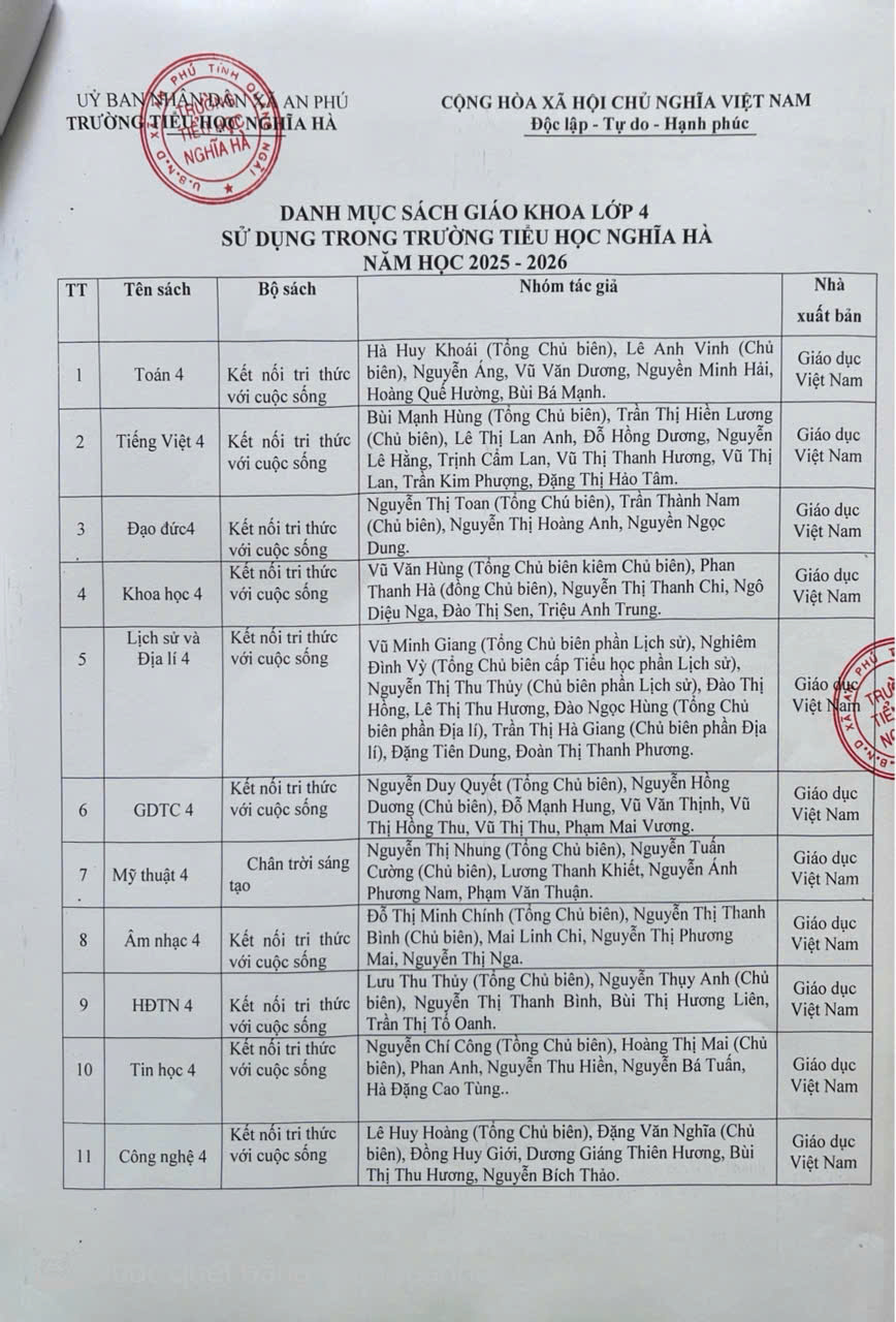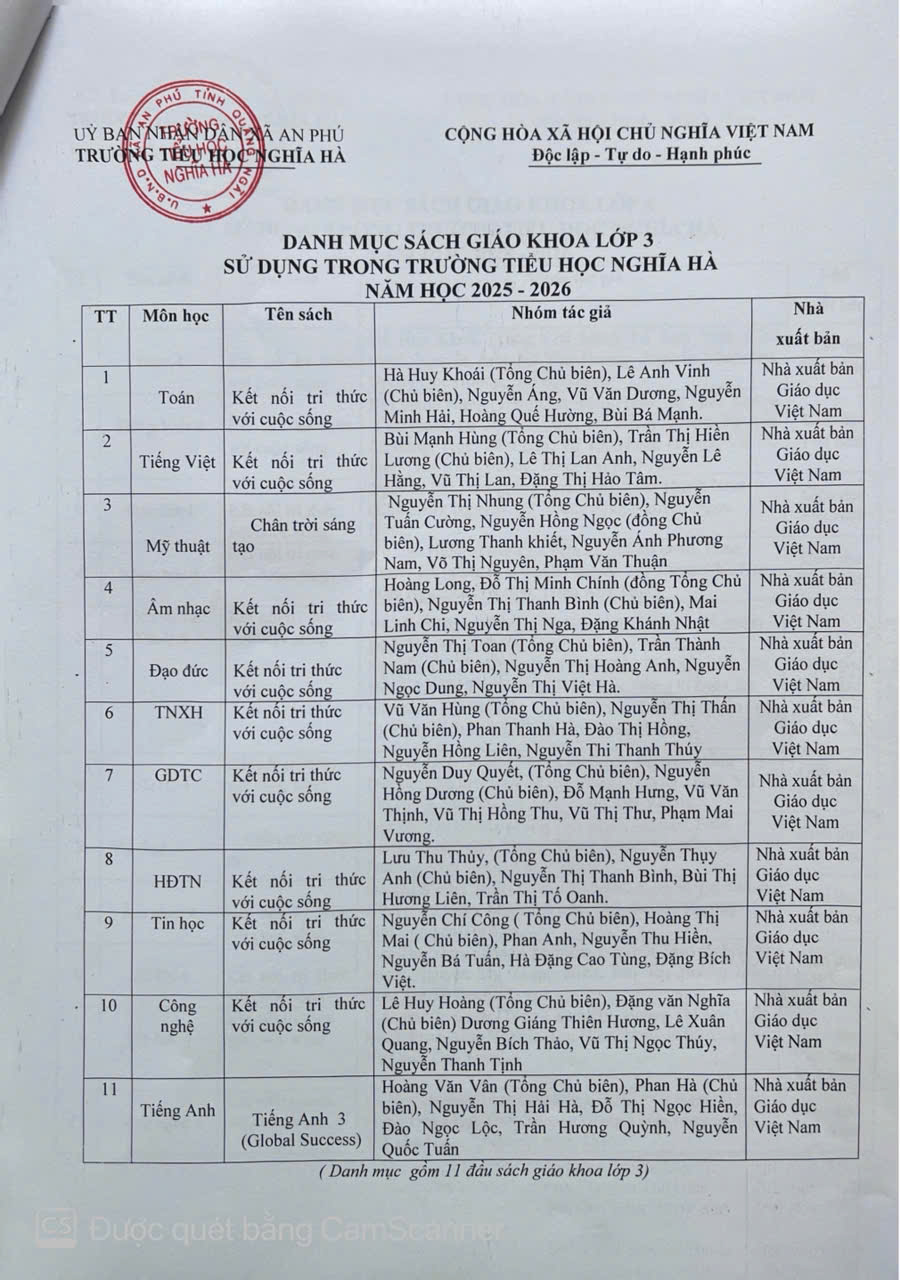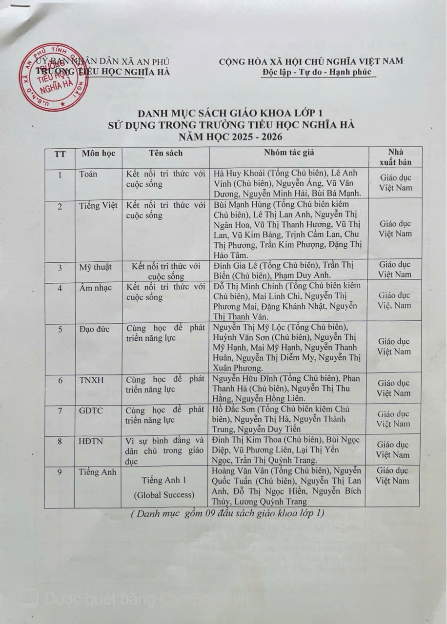 DANH MỤC SÁCH GIÁO KHOA SỬ DỤNG TRONG TRƯỜNG TIỂU HỌC NGHĨA HÀ