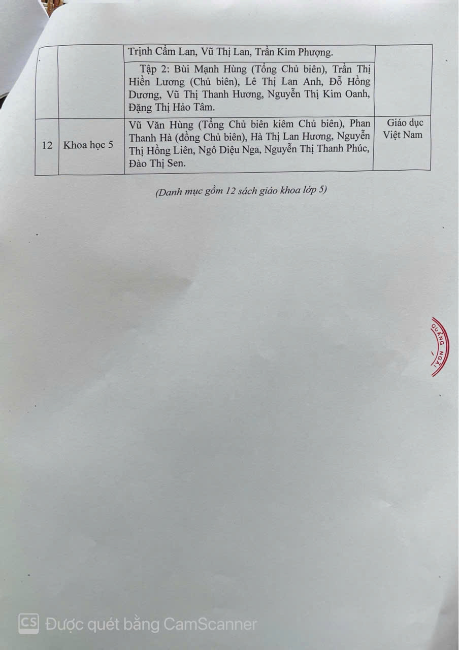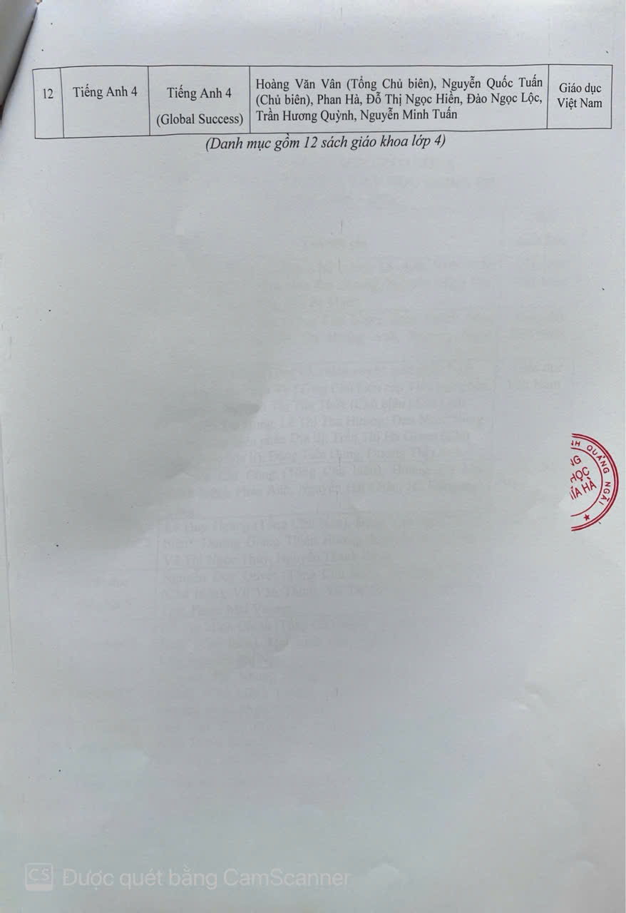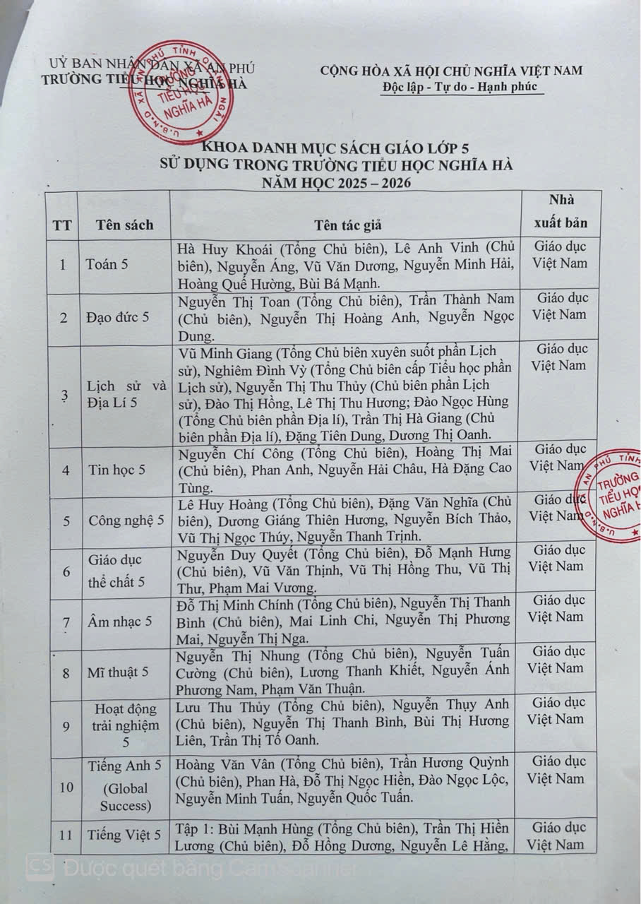 DANH MỤC SÁCH GIÁO KHOA SỬ DỤNG TRONG TRƯỜNG TIỂU HỌC NGHĨA HÀ
